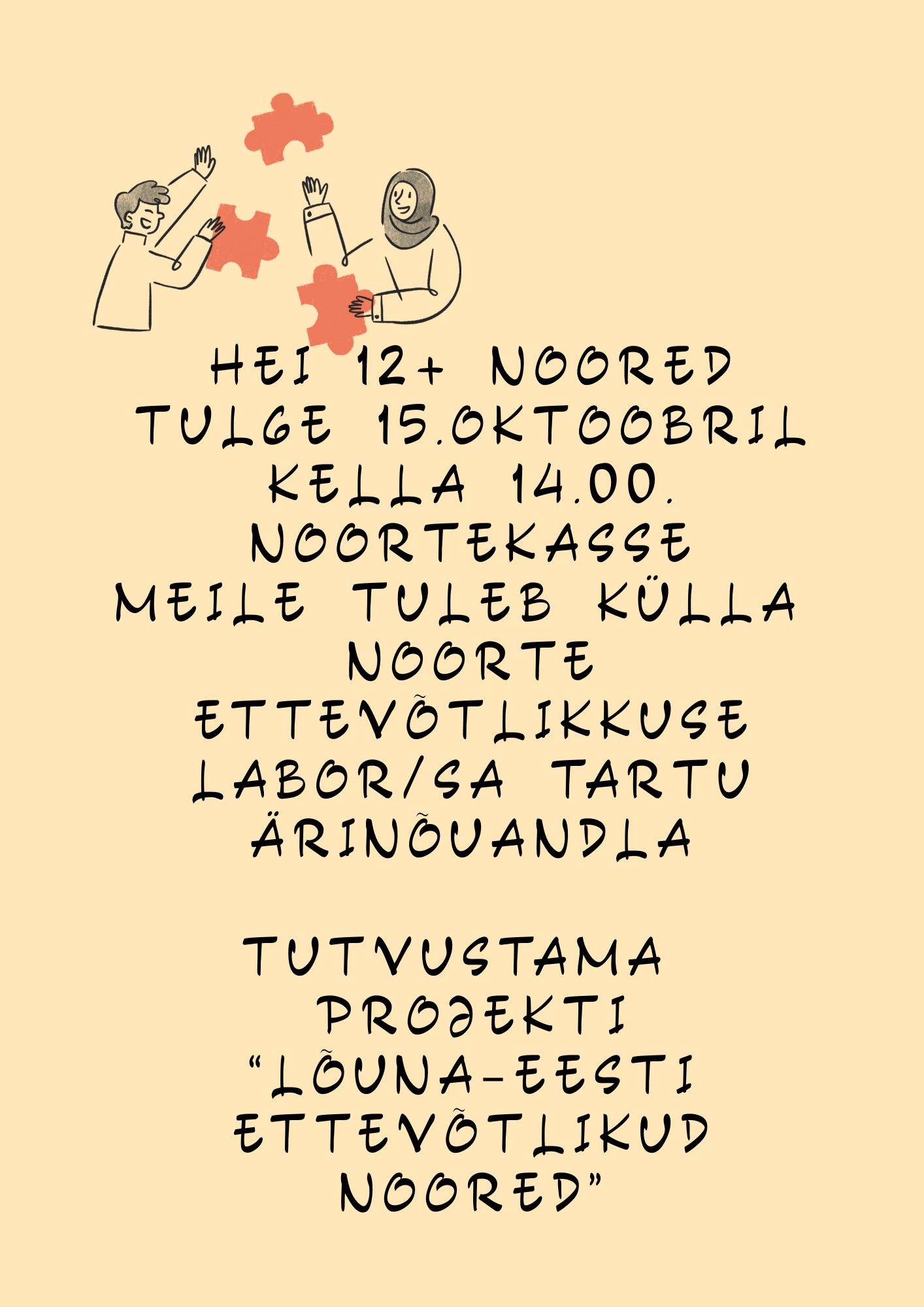 Tule 15.oktoobril noortekeskusesse kella 14.00 alustame ja saa osa projektist “Lõuna-Eesti ettevõtlikud noored”. Meile tuleb külla Ettevõtlikkuse labor/SA Tartu ärinõuandla.