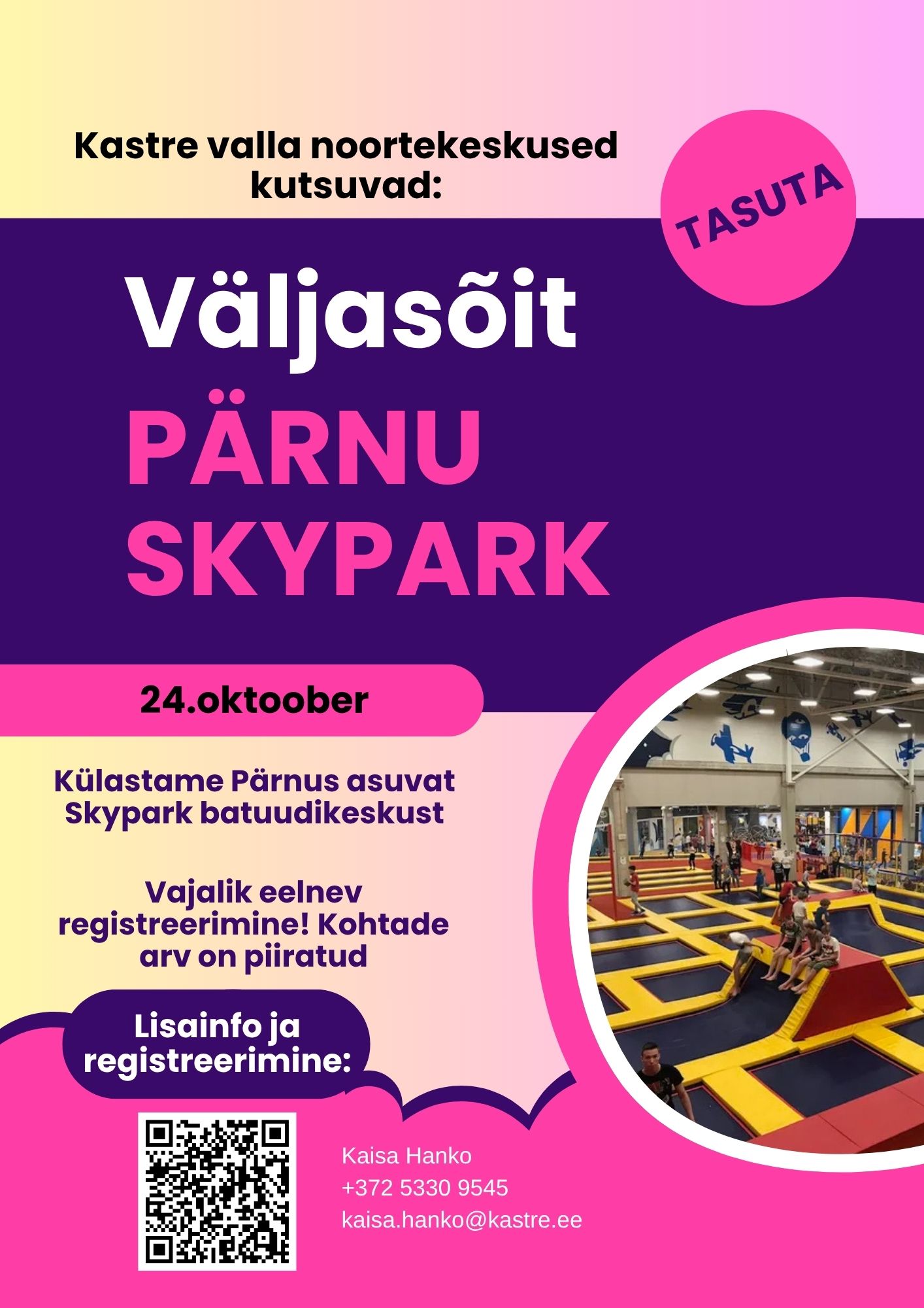 Kastre valla noortekeskused kutsuvad noori 24.oktoobril ühisele väljasõidule Pärnu Skypark batuudikeskusesse.